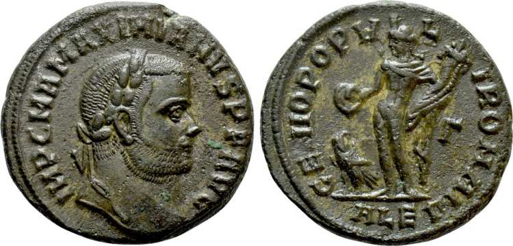 | Alexandria RIC VI 32b | Maximianus AE Follis. 301 AD. IMP C VAL MAXIMIANVS PF AVG, laureate head right / GENIO POPVLI ROMANI XX-I, Genius standing left, modius on head, pouring libations from patera and holding cornucopiae, A to right. Mintmark ALE. | Text | Image |