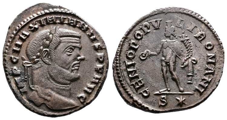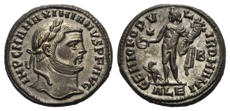 | Alexandria RIC VI 14b | Maximianus AE 26mm Follis. 294 AD. IMP C M A MAXIMIANVS PF AVG, laureate head right / GENIO POPVLI ROMANI, Genius standing left holding patera, from which liquor flows, and cornucopiae. Officina letter B in right field. Mintmark ALE. | Text | Image |