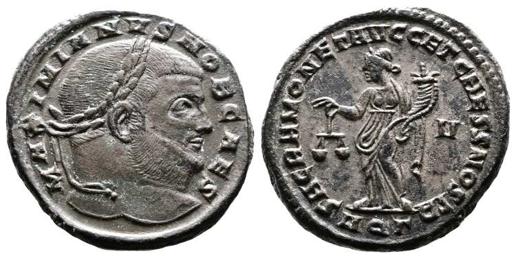 | Aquileia RIC VI 31b,S | Maximianus AE Follis. 301 AD. IMP MAXIMIANVS PF AVG, laureate head right / SACRA MONET AVGG ET CAESS NOSTR, Moneta holding scales and cornucopiae, V to right. Mintmark AQS. | Text | Image |