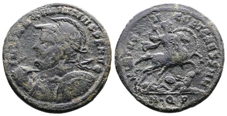 | Aquileia RIC VI 66b | Maximianus, AE folles. Aquileia, AD 286-310. 27.9 mm. 9.7 g. IMP MAXIMIANVS PF AVG, laureate, helmeted and cuirassed bust left, holding spear and shield. / VIRTVS AVGG ET CAESS NN, emperor, holding spear and shield, on horseback galloping right, fallen enemy beneath the horse. Mintmark AQP. RIC VI, 66b. | Text | Image |