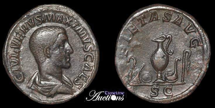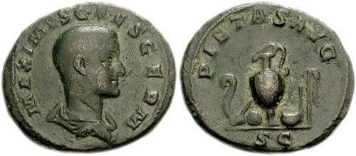 | RIC 6 Sear 8408 | Maximus, Caesar AE Sestertius. C IVL VERVS MAXIMVS CAES, bare-headed, draped bust right / PIETAS AVG, sacrificial implements, SC in ex. RIC 6, Cohen 5. | Text | Image |