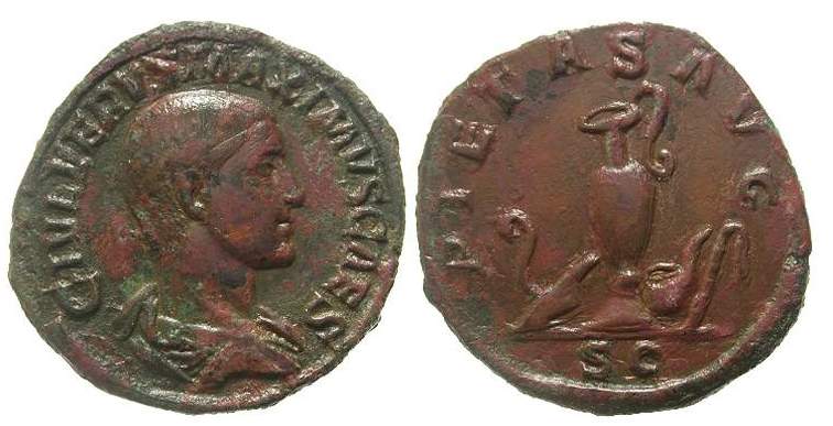 | RIC 1 Barb | Maximus Caesar Barbaric fourré denarius. IVL VERVS MAXIMVS CA, bare-headed, draped bust right / PIETAS AVG, sacrificial implements: lituus, knife, jug, simpulum (ladle) and sprinkler. | Text | Image |