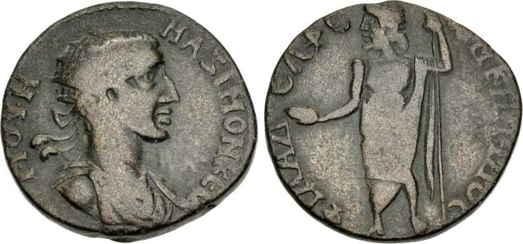 | Tralles Mionnet IV, 1110 | Maximus, AE31 of Tralles, Lydia. AD 235-238. Magistrate Jul. Ailianos. Γ IOY OYH MAXIMOC KAI, laureate, draped bust right / EΠI ΓΡ IOYΛIANOY AIΛIANOY TΡAΛΛIANΩN, Tyche standing left, kalathos on head, holding rudder in right hand and cornucopiae in left. Hunter 9; Mionnet IV, 1110; Paris 1713; GRPC Lydia 326. | Text | Image |
