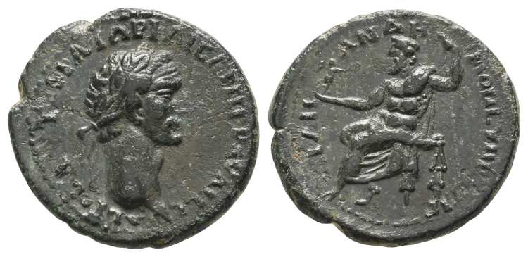 Hierapolis- Kastabala SNG Lev 1580 | Nerva, AE16 of Hierapolis-Castabala, Cilicia. AD 96-98. 2.52 g. NEΡOYAC KAICAΡ (from top right), laureate head right / IEΡOΠOΛITΩN (from top right), eagle standing left on club, wings closed. SNG Levante 1580. | Text | Image | |