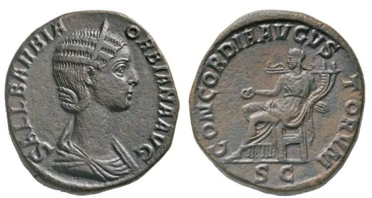 | RIC 656 Sear8195 | Orbiana AE As. 225 AD. SALL BARBIA ORBIANA AVG, diademed and draped bust right / CONCORDIA AVGVSTORVM, S-C in ex, Concordia seated left on throne, holding patera and double cornucopiae. Cohen 5. | Text | Image |