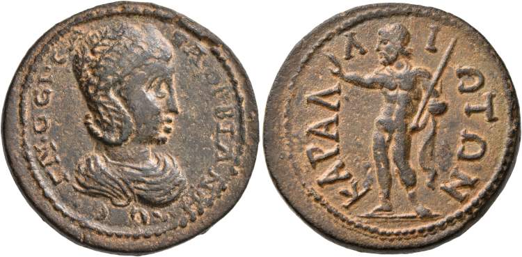 | Carallia BMC 3 | Orbiana, AE32 of Carallia, Cilicia. AD 225-235. 21.18 g. ΓN CE EΡ CA BA OΡBIANHC, draped bust right. / KAΡAΛΛIΩTΩN, male figure, naked but for chlamys around neck and falling behind, standing left, holding sceptre and raising right hand. BMC 3; Watson 201. | Text | Image |