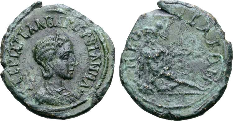 | Trapezus RecGen 41 | Orbiana, AE29 of Trapezus, Pontus. Dated local year 163, AD 226-227. 12.37 g. OΡB CAΛOY OΡBIANHN AYΓ-O-Y, draped bust right, wearing stephane. / TΡAΠEZOYNTIΩN E ΡΞΓ, Mithras on horseback right, tree behind, small altar to right. RecGen 41; Wojan 107 (this coin). | Text | Image |