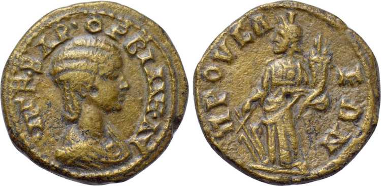 | Prusa ad Olympum RecGen 141 | Orbiana AE20 of Prusa ad Olympum, Bithynia. AD 222-235. 5.7 g. ΓN CE BAΡ OΡBIANH AY, draped bust right. / ΠΡOYCAEΩN, Tyche standing left, holding rudder and cornucopiae. RecGen 141; Waddington 511. | Text | Image |
