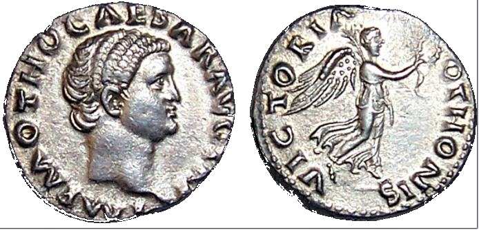 | RIC 16v | Otho, AR Denarius, Rome, Jan.-April 69 AD. IMP OTHO CAESAR AVG TR P, bare head right / VICTORIA OTHONIS, Victory walking left, holding wreath and palm branch. RIC I, 16 var. (Obv legend with this reverse); BMCRE 24 var.; Probably an ancient forgery. | Text | Image |