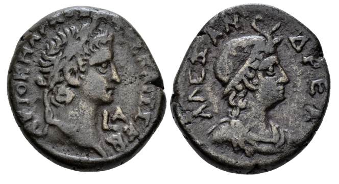 | Alexandria Milne 363 Sear 2168 | Otho Billon Tetradrachm of Alexandria. AD 69. AYTOK MAΡK OΘΩNOΣ KAIΣ ΣEB, laureate head right, LA before / EIΡHNH, draped and veiled bust of Eirene right, caduceus behind. Milne 363; SGI 668, RPC 5360. | Text | Image |