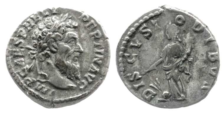 RIC 2 | Pertinax, AR denarius, Rome AD 193. 17.8 mm, 3.05 g. IMP CAES P HELV PERTIN AVG, laureate head right. / DIS CVSTODIBVS, Fortuna standing left, holding rudder on globe and cornucopiae. RIC 2; RSC 14. | Text | Image |