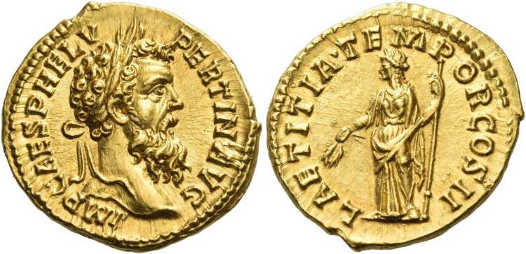 RIC 4a aureus | Pertinax, AV Aureus, AD 193. 7.23 g. IMP CAES P HELV PERTIN AVG, laureate head right. / LAETITIA·TEMPOR COS II, Laetitia standing left, holding wreath and sceptre. RIC 4a; Cohen 19; BMCRE 7; Calicó 2383. | Text | Image |