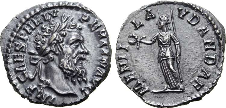 RIC 4a denarius Sear5 #6041 | Pertinax Denarius. IMP CAES P HELV PERTIN AVG, laureate head right / LAETITIA TEMPOR COS II, Laetitia standing left, holding wreath and sceptre. RSC 20. | Text | Image |
