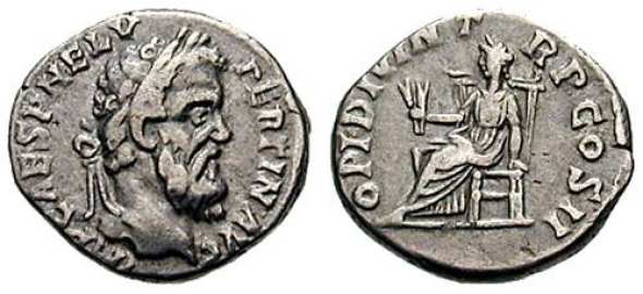 RIC 9 | Pertinax, AR denarius, Rome AD 193. 17.8 mm, 3.05 g. IMP CAES P HELV PERTIN AVG, laureate head right. / OPI DIVINAE TR P COS II, Ops seated left, holding two corn ears, left hand on chair seat. RIC 9; Cohen 37. | Text | Image |