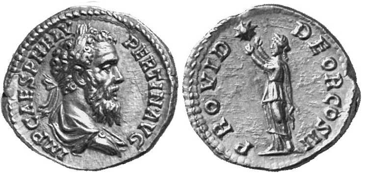 RIC 11a Sear5 6046 | Pertinax Denarius. IMP CAES P HELV PERTIN AVG, laureate head right / PROVID DEOR COS II, Providentia standing left, raising right hand raised toward star, left hand on her chest. RSC 43; Sear 6046. | Text | Image |