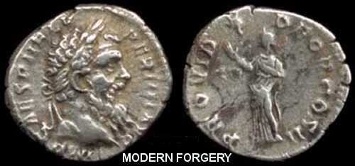 MODERN FORGERY RIC 11 | Two identical examples of a modern Bulgarian forgery of the Pertinax Denarius RIC 11. Pertinax AR Denarius. Alexandria Mint. IMP CAES P HELV PERTIN AVG, laureate head right / PROVID DEOR COS II, Providentia standing left, right hand raised toward a star above, left hand on her chest. Forgeries Of RSC 43; RIC 11; Sear 6046. | Text | Image |