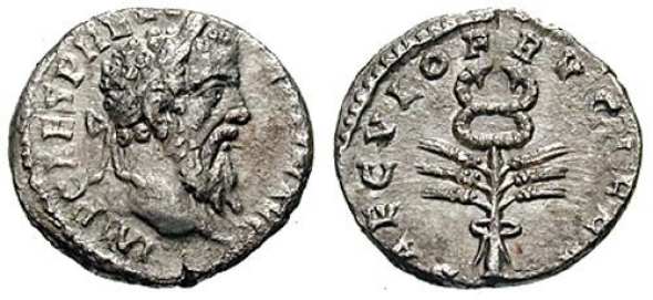 RIC 12 Sear5 #6047 | Pertinax AR Denarius. IMP CAES P HELV PERTIN AVG, laureate head right / SAECVLO FRVGIFERO, caduceus with six corn ears attached in the form of wings. RIC 12; RSC 54. | Text | Image |