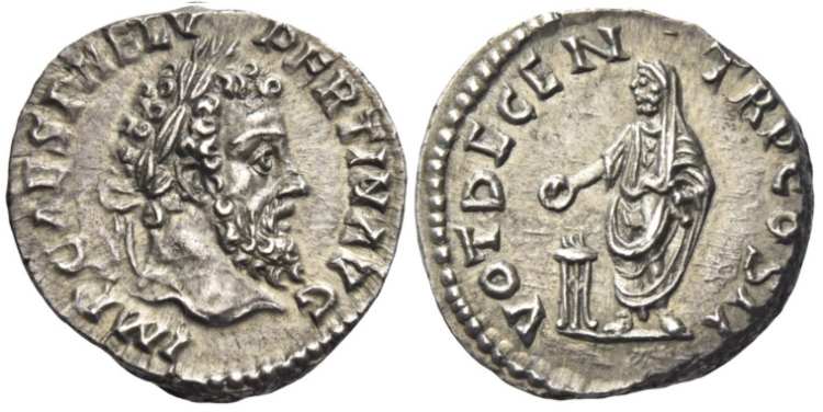 RIC 13a denarius Sear5 6048 | Pertinax Denarius. IMP CAES P HELV PERTIN AVG, laureate head right / VOT DECEN TR P COS II, emperor sacrificing left, with patera held over tripod altar. RIC 13a; RSC 56; BMCRE 24. | Text | Image |
