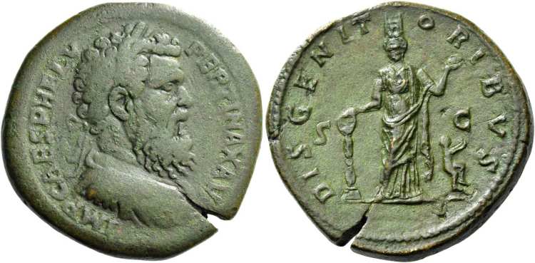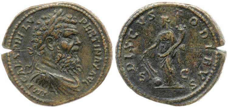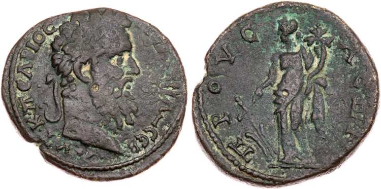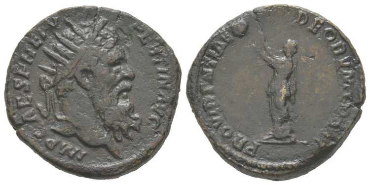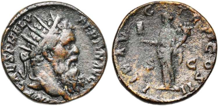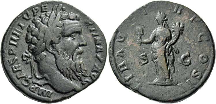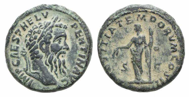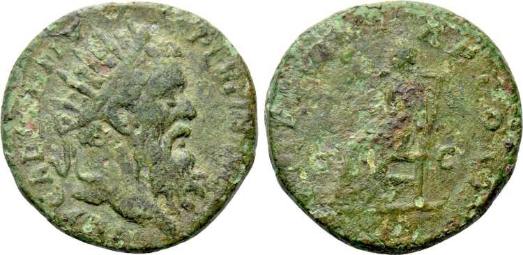 RIC 25 | Pertinax, AE dupondius. AD 193. Rome. 12.58 g. IMP CAES P HELV PERTIN AVG, radiate head right. / LAETITIA TEMPORVM, Laetitia standing left, holding wreath and sceptre. RIC 25. | Text | Image |