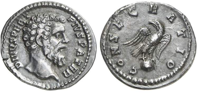 RIC 24A[sept] Sear5 6547 | Divus Pertinax AR Denarius, Struck under Septimius Severus, 193 AD. DIVVS PERT PIVS PATER, bare head right / CONSECRATIO, eagle standing half-right on globe, head left. RSC 6. | Text | Image |
