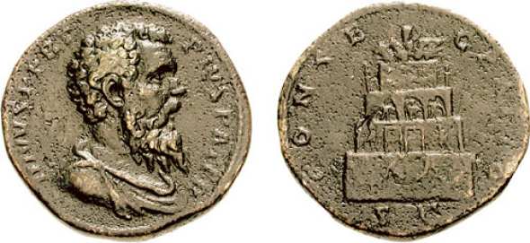 Prusa RecGen 65 | Pertinax, AE30 of Prusa ad Olympum, Bithynia. 193 AD. 14.94 g. AYT K ΠEΛBIOC ΠEΡTINAX CEB, Laureate, bearded head right / ΠΡOYCAEΩN, Hexastyle temple. RecGen 65; BMC 14; SNG Righetti 677. | Text | Image |