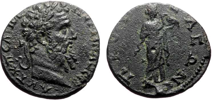 Prusa ad Olympum wwxls 41291 | Pertinax, AE26 of Prusa ad Olympum, Bithynia. AD 193. 8.8 g. AYT K ΠEΛBIOC ΠEΡTINAX CEB, laureate head right. / ΠΡOYCAEΩN, Hygieia standing right, feeding serpent in arms. wwxls 41291; Numismad 9, 763. | Text | Image |