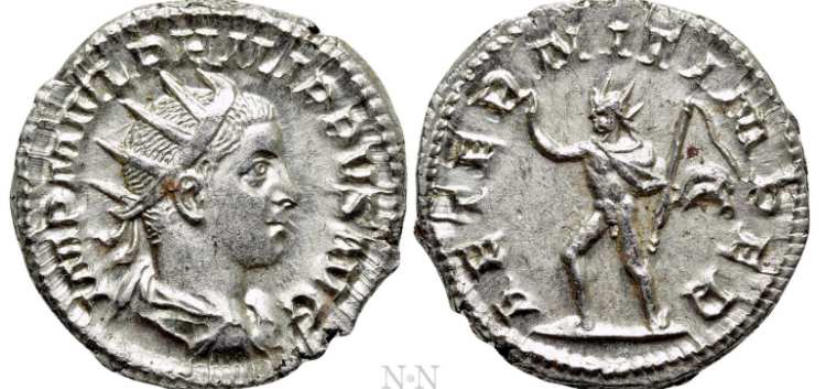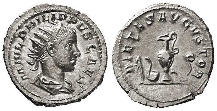 | RIC 240a | Philip II, Bi. Antoninianus, Antioch. AD 244-249. IMP M IVL PHILIPPVS AVG, radiate, draped and cuirassed bust right. / AEQVITAS AVGG, Aequitas standing facing, head left, holding scales and cornucopiae. RIC 240a; RSC 1. (Hybrid with reverse of Philip I). | Text | Image |