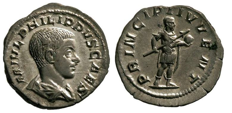 | RIC 216b Sear 9247 | Philip II, as Caesar, AR Denarius. M IVL PHILIPPVS CAES, bare headed and draped bust right, seen from behind / PRINCIPI IVVENT, Philip standing right, holding transverse spear and globe. RSC 53. | Text | Image |