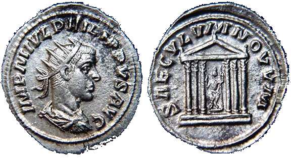 | RIC 244 Sear 9276 | Philip II AR Antoninianus. Antioch mint, 247-249 AD. IMP M IVL PHILIPPVS AVG, radiate, draped and cuirassed bust right / SAECVLVM NOVVM, hexastyle temple, statue of Roma within. RSC 8. | Text | Image |