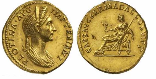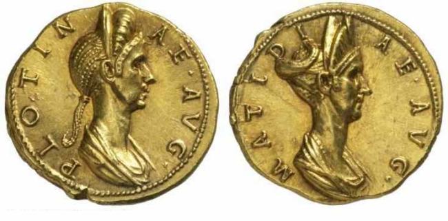 RIC 34 [hadrian] | Plotina and Matidia. AV Aureus. 117-118 AD. PLOTINAE AVG, Plotina diademed, draped bust right / MATIDIAE AVG, Matidia diademed, draped bust right. RIC 34 (Hadrian); BMC 53 (Hadrian); Vagi 1321, Cohen 1. | Text | Image |