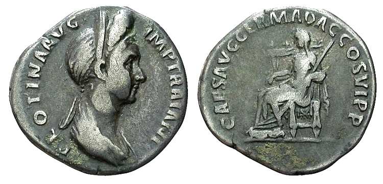 RIC 731 | Plotina, AR denarius. Rome, AD 112-115. Struck under Trajan. 19 mm, 2.93 g. PLOTINA AVG IMP TRAIANI, Draped bust right, with double stephane. / CAES AVG GERMA DAC COS VI P P, Vesta, veiled, seated left, holding sceptre.RIC 731; BMCRE 526; RSC 3. | Text | Image |