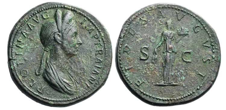 RIC 740 Sear5 #3376 | Plotina AE Sestertius. Struck 112 AD. PLOTINA AVG IMP TRAIANI, draped bust right, wearing double stephane / FIDES AVGVST S-C, Fides standing right, holding grain ears and plate of fruit. RIC 740; Cohen 12; BMCRE 1080; Cohen 12: Paris 730. | Text | Image |