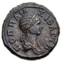 | Perinthos RPC 1756 | Poppaea, Wife of Nero, AE 22 mm of Perinthus, Thrace. ΠOΠΠAIA ΣEBAΣTH, draped bust right / Headdress of Isis, Π-E to left and right, all within laurel wreath. RPC 1756; Moushmov 4424; Schönert-Geiss, Perinthos, 277; Varbanov 27. | Text | Image |