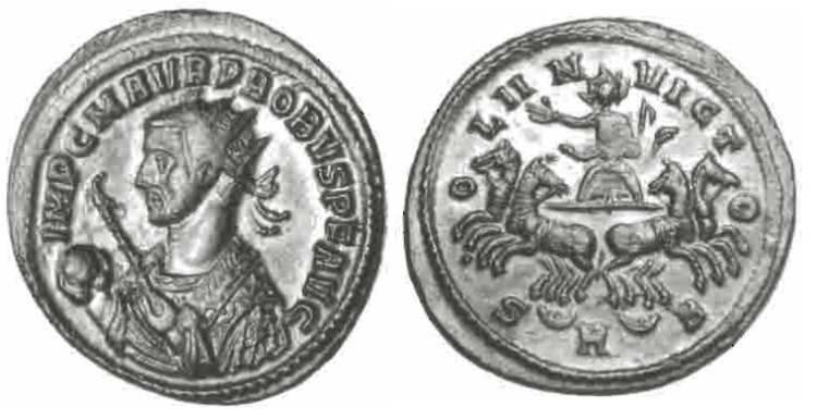 | RIC 911,Δ | Probus AE Antoninianus. Cyzicus. IMP CM AVR PROBVS PF AVG, radiate bust left, wearing imperial mantle, holding eagle-tipped sceptre / SOLI INVICTO, Sol in spread quadriga facing. Mintmark Δ. | Text | Image |