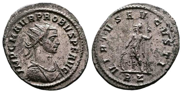 | RIC 84 | Probus Silvered AE Antoninianus. Lyons Mint, 278-279 AD. IMP C PROBVS P F AVG, radiate, cuirassed bust right / MARS VICTOR, Mars walking right holding spear and trophy. Mintmark III. Cohen 334. | Text | Image |