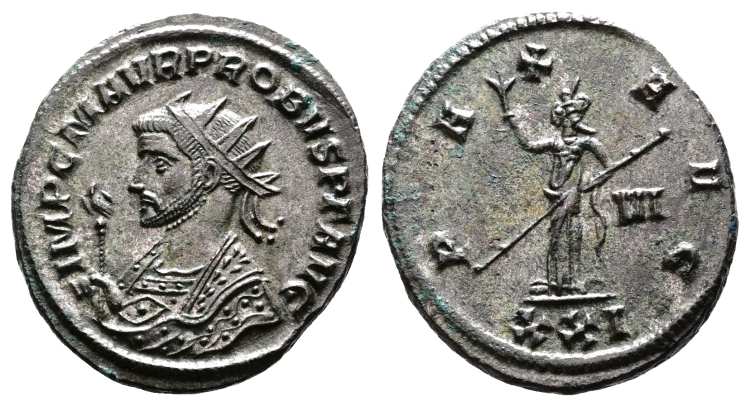 | RIC 90v | Probus, Lyons, AE Antoninianus. IMP C M AVR PROBVS AVG, Radiate bust left wearing imperial mantle, holding Victory on globe in right hand / PAX AVG, Pax standing left, holding olive-branch and sceptre. Mintmark IIII. RIC 90 var (bust type); Bastien 341. | Text Text | Image Image |