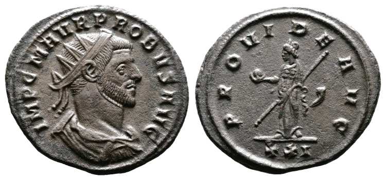 | RIC 46 | Probus AE Antoninianus. Lyons mint. IMP C M AVR PROBVS AVG, radiate, cuirassed bust right / PROVIDENTIA AVG, Providentia standing left, holding globe and cornucopiae. Mintmark III. Cohen 496. | Text | Image |