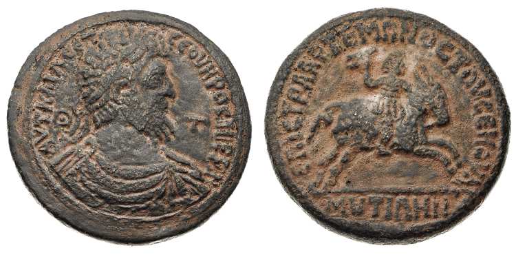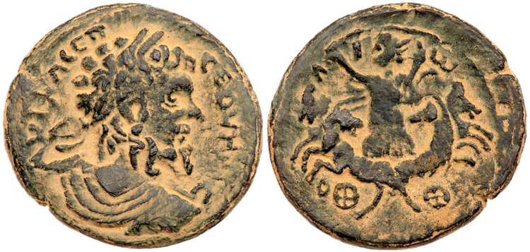 | Trapezus RecGen 16 | Septimius Severus, AE32 of Trapezus, Pontus. Dated local year 131, AD 198-199. 20.74 g. AYTO KAI Λ CEΠ CEYH CEΠT CEB, laureate, draped and cuirassed bust right. / TΡAΠEZOYNTIωN ETOYC AΛΡ around and below, Mithras on horseback riding right, tree to left, altar to right. RecGen 16; Wojan 33-34. | Text | Image |