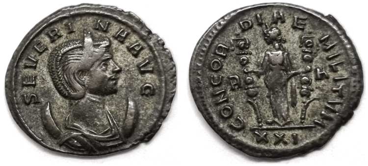 | RIC 18 | Severina Silvered AE Antoninianus. Cyzicus mint. SEVERINA AVG, diademed & draped bust right on crescent / CONCORDIAE MILITVM, Concordia standing left, holding two standards, mintmark XXI. Cohen 7. | Text | Image |
