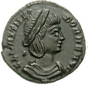 | Trier RIC VIII 64 corr. | Theodora AE16 follis, Trier. AD 337-340. FL MAX THEODORAE AVG, laureate and mantled bust right. / PAX PVBLICA, Pax standing left, holding branch and transverse sceptre. Mintmark dot TRS dot. RIC VIII Trier 64 corr.; Coleshill hoard 246. | Text | Image |