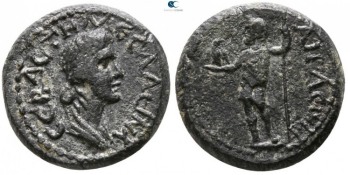 | Aegae RPC 2430 | Valeria Messalina AE17 of Aeolis, Aegae. CEBACTH MECAΛEINA, draped bust right / AIΓAEION, Zeus standing left, holding eagle and sceptre. RPC 2430; SNG Cop 23; Moustier 431-470; Paris 30; Vienna 32680; SNG Lewis 1413; Weber 5470. | Text | Image |