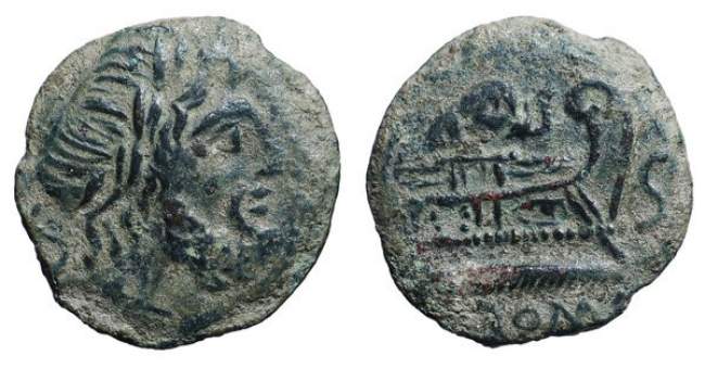 | Caecilia 9 | A. Caecilius. AE Semis. 169-158 BC. 11.8 g. Laureate head of Saturn right, S behind head. / Prow of galley right, A CAE (ligate) above, S to right, ROMA below. Caecilia 9; Syd. 355a. Cr. 174/2; Sear 831; BMCRR 817-819. | Text | Image |