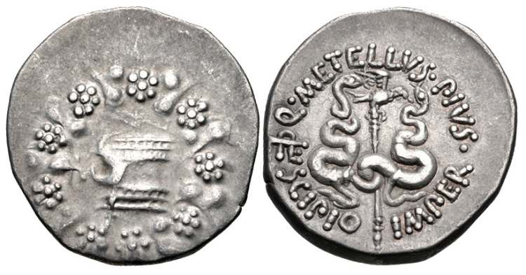 | Caecilia 75 SG 3953 | Pergamon, Mysia. Q Caecilius Metellus Pius Scipio, Imperator. c49-48 BC. AR Cistophoric Tetradrachm. Cista mystica with serpent; all within ivy wreath / Q METELLVS PIVS SCIPIO IMPER, serpents around aquila; ΠEΡ monogram left. CNR Caecilia 75, BMC 128. | Text | Image |