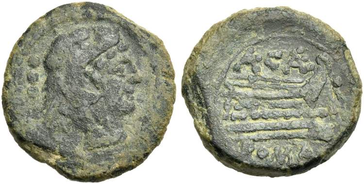 | Caecilia 41 | L. Caecilius Metellus Diadematus. AE Quadrans. Unnamed issue. 128 BC. Rome. 3.38 g. Head of Hercules right wearing lionskin headdress, three dots behind head. / Prow of galley right; elephant's head above, three dots to right, ROMA below. Caecilia 41; Crawford 262/4; Sydenham 497b; BMCRR 1051; Sear 1163. | Text | Image |