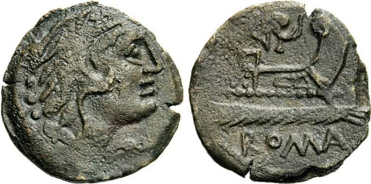 | Caecilia 11 | A. Caecilius. AE Quadrans, 169-158 BC, 21 mm, 7.76 g. Head of Hercules right, wearing lionskin headdress, three dots behind head. / A CAE ligate above prow right, three dots to right, ROMA below. Babelon Caecilia 11; Syd 355c; RBW 740; Crawford 174/4; Sear 1106. | Text | Image |