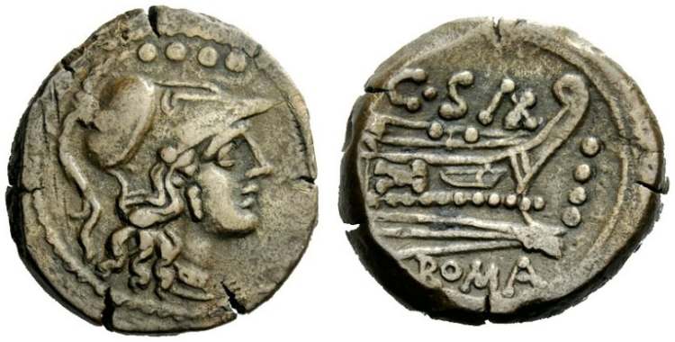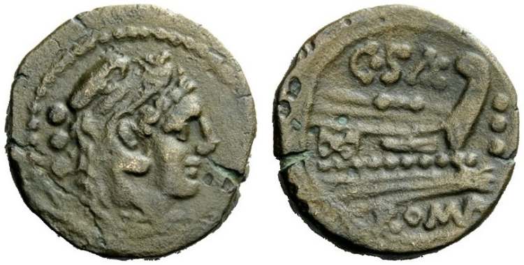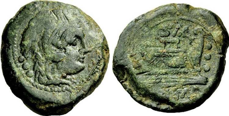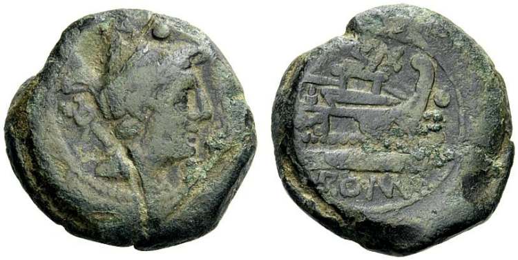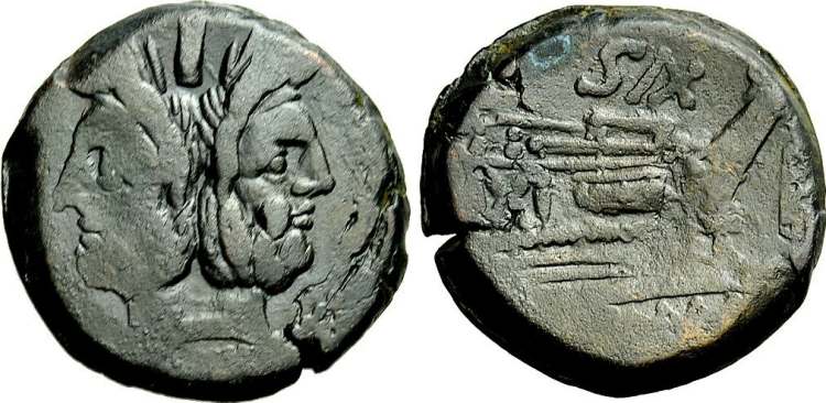 | Clovia 1 var | Anonymous. 169-158 BC. AE As. Laureate head of Janus; I above / Prow of galley right; SIX (sic) above, I before, ROMA below. Cr180/1 var, Syd 361 var. | Text | Image |