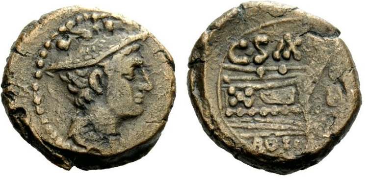 | Clovia 9 | C. Sax. Quadrans circa 169-158, AE 5.26 g. Head of Hercules right, wearing lionskin headdress, three dots behind head. / Prow right, C·SAX ligate above, three dots to right. ROMA below. Babelon Clovia 9. Sydenham 360c. RBW 735. Crawford 173/4. | Text | Image |