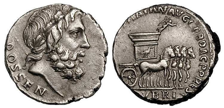 | RIC 777[trajan] | Restoration coinage of Trajan: L Rubrius Dossenus Denarius. Rome mint, ca 107 AD. DOSSEN, laureate head of Jupiter right, scepter behind / L RVBRI in exergue, IMP CAES TRAIAN AVG GER DAC P P REST around, tensa (ceremonial chariot in circus procession) drawn right by four horses, eagle standing right on side panel, statuette of Victory bearing wreath & palm attached to wagon rim.