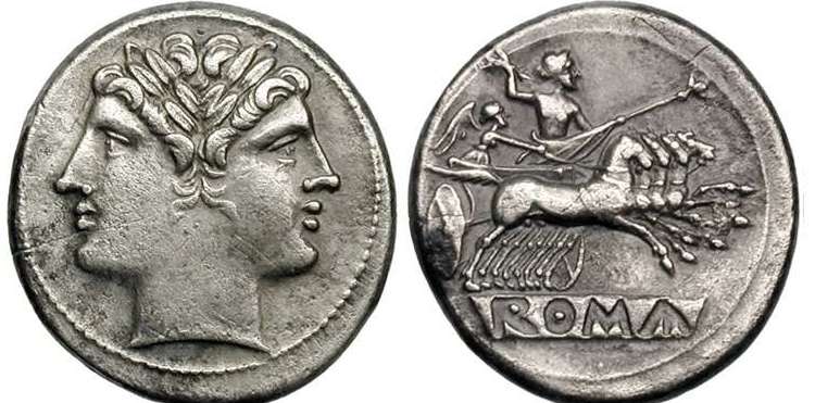 Anonymous, base silver quadrigatus-didrachm. 213-212 BC. Laureate head of Janus / Jupiter in quadriga driven by Victory, ROMA raised below. Syd.68, C28/3.