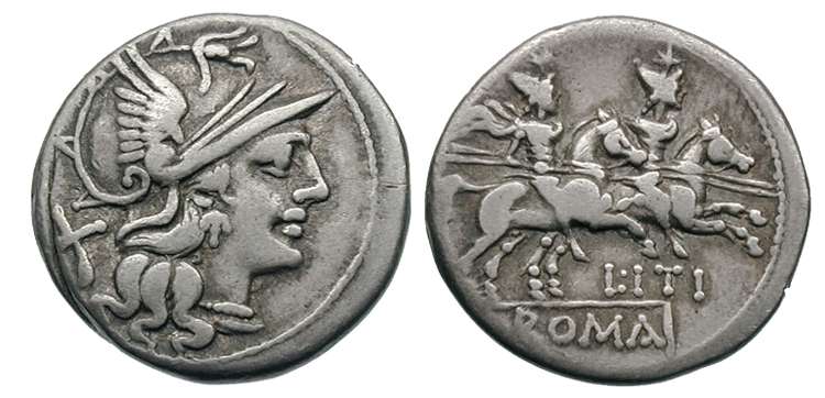 L. Itius. 149 B.C. Denarius. Helmeted head of Roma r.; behind, X / Dioscuri, below, L. ITI; in exergue, ROMA. Syd 394a. Crawford 209/1.